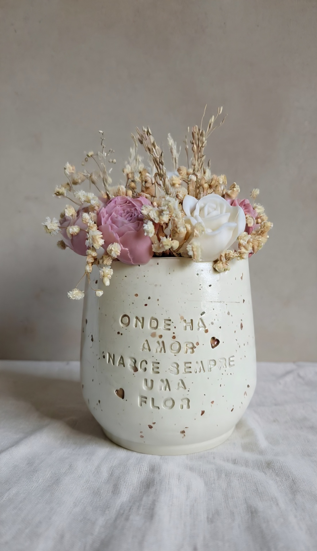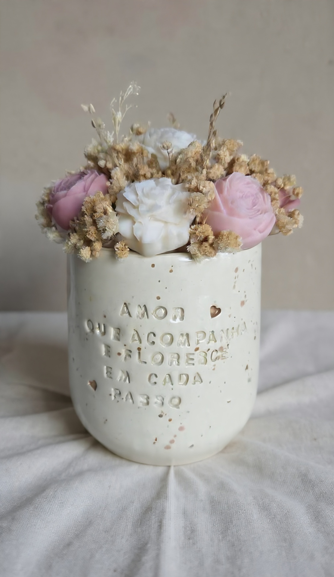 Feito com flores de cera de soja, decora o espaço e ajuda a criar um ambiente mais acolhedor, com uma fragrância que se sente (Linho) .