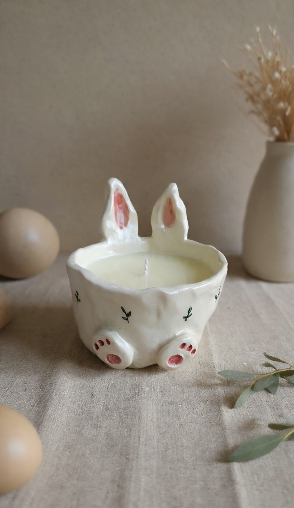Vela Bunny bloom 25,50 € Desconto de %. Partilhar Comprar Contactar Uma vela delicada que traz o encanto da Páscoa para dentro de casa. Este recipiente é moldado e pintado à mão em cerâmica, tornando cada peça única. Depois de preenchido com cera de soja perfumada, transforma-se numa vela especial que combina decoração e aroma num só objeto. A fragrância Côco & Citrus envolve o espaço com um aroma leve e reconfortante, com um toque fresco e luminoso. Uma peça pensada para quem gosta de detalhes diferentes e de uma casa perfumada com elegância. Cada peça é única podendo haver pequenas variações de detalhes. Estima-se que o tempo para envio possa ir até 5 dias.