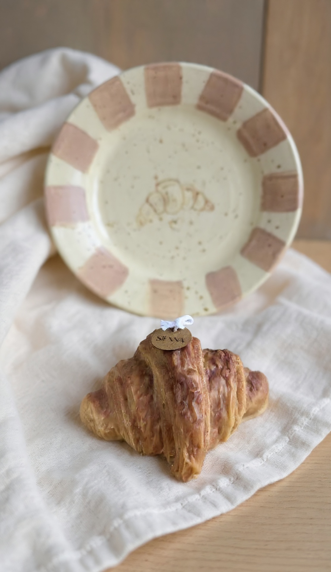 Feita com cera de soja e perfumada com Butter Whispers, esta vela decorativa em forma de croissant espalha um aroma quente e envolvente que lembra um croissant acabado de sair do forno, com suaves notas de manteiga.