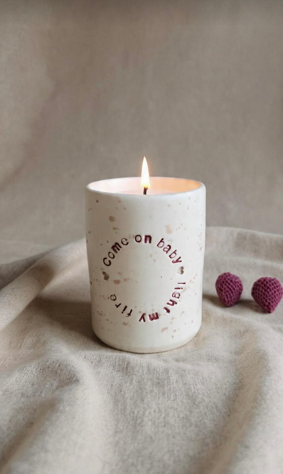 Produzida com cera vegetal de soja e pavio de algodão, esta vela é apresentada num copo de cerâmica feito à mão pela Baratata, pensado para continuar a ser usado depois da vela terminar. Como porta-canetas, porta-pincéis ou objeto decorativo.
